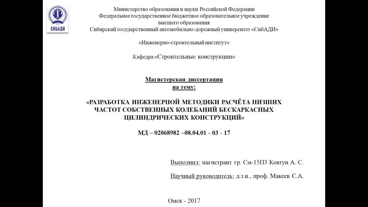 Представлен процесс защиты магистерской диссертации в СибАДИ (ИСИ). Направление подготовки 08.04.01 «Строительство», магистерская программа "Теория и проектирование зданий и сооружений". Выполнил магистрант Ковтун А.С. Тема: «Разработка инженерной методики расчета низших частот собственных колебаний бескаркасных цилиндрических конструкций». Руководитель программы д-р техн. наук, профессор Макеев С.А.