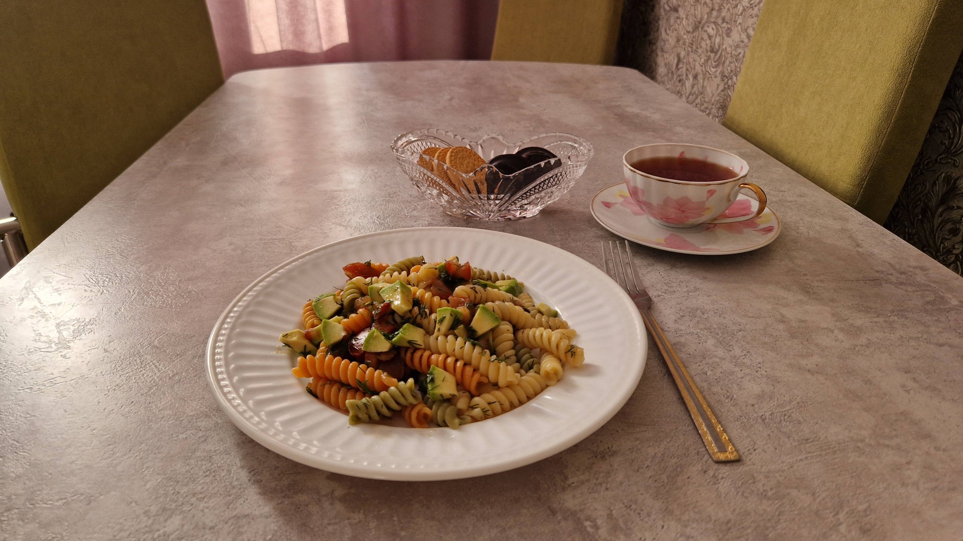Быстрый и сытный завтрак. Тёплый салат из макарон. #салат #завтрак