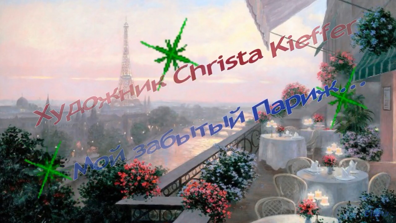***** Художник Криста Киффер (Christa Kieffer) родилась в Германии . Среднее образование получила в Европе, потом переехала в США, окончила художественное училище в Лос-Анджелесе. Много лет работала в крупных компаниях прежде чем решилась стать профессиональным художником. Криста Киффер живет в Америке, а на своих картинах пишет Париж. И не Париж сегодняшний, а Париж конца XIX века. Уютные улицы, мужчины во фраках, элегантные дамы и много цветов… Париж-мечта и ожидание чуда. Париж Christa Kieffer — это ожившая на полотнах мечта художника. Она смотрит на улицы города и представляет, какими они могли быть сто с лишним лет назад: каменные мосты, увитые цветами дома, запах кофе и изысканных духов. Подари мне Париж и "Фиалку Монмартра", Фантастический воздух в столице любви... Аромат Тюильри, Триумфальную арку, Парк Монсо, где свежо и поют соловьи. Модельяни, Лотрека, На бульваре Клиши дом, где жил Пикассо... Нотр-Дам де Пари и жемчужину века - Лувр,в котором венчались на трон короли. Подари мне Париж, кабаре Moulin Rouge, На затерянных улочках свет фонарей... И в кафе Сен-Луи романтический ужин, На котором меня назовешь ты своей. стих.Татьяна Воронцова Видеомонтаж Елены Короед Для просмотра и прослушивания с наилучшим изображением и звуком выставляем на шестеренке справа внизу настройку 1080р .................................................................................................................................