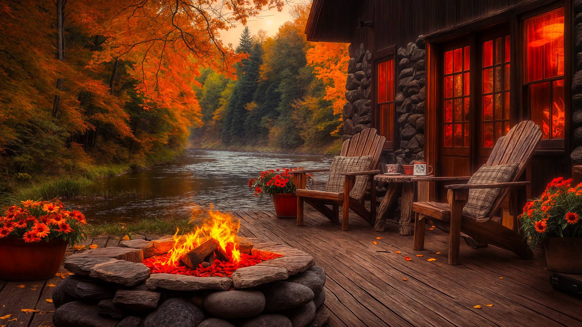 🍁 Успокаивающая Атмосфера Осеннего Домика у Реки! Уютный Костер и Расслабляющие Звуки Природы