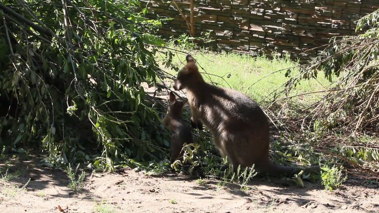 В 2007 году из немецкого города Галле в Новосибирский зоопарк доставили группу из пяти кенгуру Беннетта. Их домом стал вольер в павильоне «Тропический мир». Первый малыш у наших кенгуру Беннетта появился на свет в 2008 году. Детёныши кенгуру появляются на свет настолько крохотными, что их путь от родового отверстия до сумки практически всегда не заметен со стороны. Вес новорожденного кенгурёнка всего 1 г. Вылезать из сумки детёныши кенгуру Беннетта начинают в возрасте 6-8 месяцев. Большие серые кенгуру появились в коллекции Новосибирского зоопарка в 2008 году. Тогда из Израиля была доставлена первая пара. Позже были привезены ещё несколько больших серых кенгуру. В 2014 родился первый малыш. Вольеры кенгуру в зоопарке состоят из двух частей: тёплый павильон с выходом на улицу. Выходы на улицу им открывают ранней весной, когда ещё лежит снег, и закрывают поздней осенью. Уличные прогулки наши кенгуру продолжают вплоть до -10 градусов. Еще осенью стали заметны увеличившиеся сумки у самок больших серых кенгуру. И стало ясно, что в сумках у мам кенгуру есть малыши. С каждым месяцем сумки увеличивались, начали шевелиться, затем малыши стали показывать то хвост, то лапы, а иногда и выглядывать. Два детеныша достигли такого возраста, когда в маминой сумке еще не тесно, но уже хочется гулять самому. Один малыш впервые вышел из сумки в середине марта, другой – в начале апреля.
