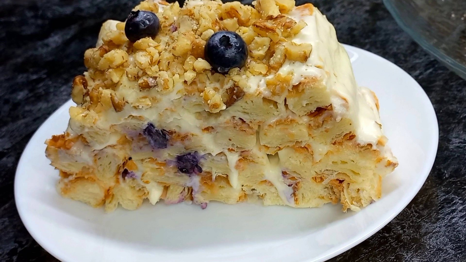 Рецепт: - слоеное тесто - масло сливочное 170 гр. ( 1 пачка) - сгущенка 1 банка - орехи грецкие - голубика В духовку 200 гр. 10-15 минут. #торт#тортырецепты#тортизслоеноготеста#тортсягодами#тортсорехами#тортполенница