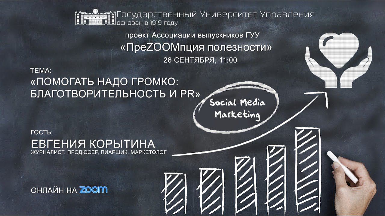 26 сентября вышел очередной выпуск нового сезона «ПреZOOMпции полезности»! Гостем стала Евгения Корытина – выпускница ГУУ, журналист, продюсер, пиарщик, маркетолог. Тема выпуска: «Помогать надо громко: Благотворительность и PR». В рамках темы Евгения обсудила со зрителем интеллектуальное волонтерство, профессиональную благотворительность, «благотворительную слепоту», а также позволила себе выйти за рамки темы и порассуждать, почему студенту ГУУ гораздо легче стать журналистом РБК, не имея при этом профессионального образования, чем, например, студенту МГУ, закончившему факультет журналистики. В конце выпуска разыгрывается книга «Lean Impact. Инновации для масштабных социальных перемен». Подробнее о том, как заполучить приз – смотри в новом выпуске! Евгения также поделилась с нами полезными ссылками, позволяющими творить добро, с удовольствием делимся ими с вами: Проект против мошенничества в благотворительности с возможностью оставить жалобу о подозрительном сборе — https://stop-obman.info/category/vse-vmeste-protiv-mo.. Почему не нужно везти новогодние подарки в детские дома — https://takiedela.ru/2013/11/nikakikh-podarkov-v-dets.. Список профессиональных благотворительных фондов, которым можно доверять — https://nuzhnapomosh.ru/ Если нужна помощь, проверенный фонд можно найти здесь — https://dobro.mail.ru/sos/ Онлайн-конференция ДОБРО 2020, про то, как устроена профессиональная благотворительность. 22 и 23 октября. Участие бесплатно — https://dobro.mail.ru/conference/2020 Платформа интеллектуального волонтерства — https://procharity.ru/ Один рубль — это много, когда о нас много. Акция #рубльвдень https://365.nuzhnapomosh.ru/ Телеграм-канал #причини_добро https://t.me/prichinidobro