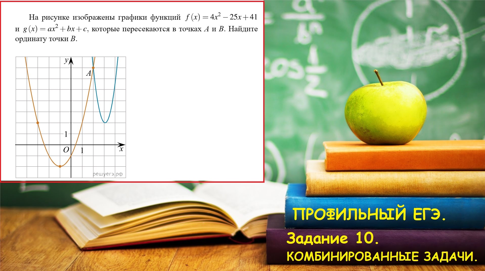 #ПрофильныйЕГЭГрафики #Профильнайтиточкупересечения #ПрофильЗадание10 #ЕГЭ2026 #ПрофильныйЕГЭ2026 #Математика2026 #ПрофильныйЕГЭГрафики #Профильнайтиточкупересечения #ПрофильЗадание10 #Профильдвепараболы #ПрофильЗадание10Комбинированныезадачи #ПрофильнайтиординатуточкиВ #Профиль2024Ященко На рисунке изображены графики функций f (x)=4*x^2-25*x+41 и g(x)=a*x^2+b*x+c которые пересекаются в точках A и B. Найдите ординату точки B. МАТЕРИАЛЫ: ПЛЕЙЛИСТ "РАЗБОР ВАРИАНТОВ ПРОФИЛЬНОГО ЕГЭ":https://rutube.ru/plst/71327/ ПЛЕЙЛИСТ "ЗАДАНИЯ ПРОФИЛЯ.ПЕРВАЯ ЧАСТЬ":https://rutube.ru/plst/71308/ ПЛЕЙЛИСТ "ЗАДАНИЯ ПРОФИЛЯ.ВТОРАЯ ЧАСТЬ. Уравнения":https://rutube.ru/plst/71324/ ПЛЕЙЛИСТ "ЗАДАНИЯ ПРОФИЛЯ.ВТОРАЯ ЧАСТЬ. Неравенства":https://rutube.ru/plst/71326/ ПЛЕЙЛИСТ "ЗАДАНИЯ ПРОФИЛЯ.ВТОРАЯ ЧАСТЬ. Стереометрия":https://rutube.ru/plst/71329/ ПЛЕЙЛИСТ "ЗАДАНИЯ ПРОФИЛЯ.ВТОРАЯ ЧАСТЬ. Планиметрия":https://rutube.ru/plst/98022/ ПЛЕЙЛИСТ "БАЗОВЫЙ ЕГЭ":https://studio.rutube.ru/playlist/71309 ПОДПИШИСЬ: 1. Запасной канал: https://www.youtube.com/watch?v=E4sjBjyTbFY&t=8s 2. Группа: https://vk.com/math_for_dummies