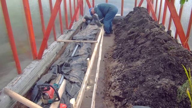 Работы в теплице новой. Подсыпка песка ,укладка труб.