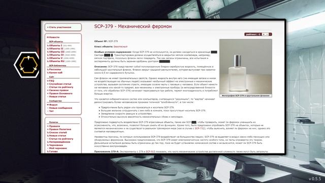Фонд SCP (SCP Foundation; Special Containment Procedures — «Особые Условия Содержания», Secure, Contain, Protect — «Обезопасить, Удержать, Сохранить») - организация, являющаяся предметом одноимённого проекта совместного веб-творчества, в русском переводе также известная просто как Фонд или Организация. Созданные в рамках проекта тексты описывают деятельность Фонда, несущего ответственность за содержание аномальных предметов, существ, мест, явлений и прочих объектов, называемых SCP-объектами. Главной частью проекта являются псевдодокументальные статьи, написанные в стиле структурированной внутренней документации о содержащихся аномалиях. ■□■□■□■□■□■□■□■□■□■□■□■□■□■□■□■□■□■□■□■□■□■□■□■ Hub 【англ.】 http://www.scp-wiki.net/ Hub 【рус.】 http://scpfoundation.net/ ╔══════════════════════════════════════╗ ▓ Оригинальная история: http://scpfoundation.net/scp-series ▓ Авторы объектов: http://scpfoundation.ru/licensing ▓ Licensing Guide: http://www.scp-wiki.net/licensing-guide ╚══════════════════════════════════════╝ ■□■□■□■□■□■□■□■□■□■□■□■□■□■□■□■□■□■□■□■□■□■□■□■ 【boosty】 https://boosty.to/schma/ 【Telegram】 http://t.me/schmatv ■□■□■□■□■□■□■□■□■□■□■□■□■□■□■□■□■□■□■□■□■□■□■□■ Пока не указано иное, содержимое этой страницы распространяется по лицензии Creative Commons Attribution-ShareAlike 3.0 License https://creativecommons.org/licenses/by-sa/3.0/ ■□■□■□■□■□■□■□■□■□■□■□■□■□■□■□■□■□■□■□■□■□■□■□■ SCP: Secret Laboratory SCP Secret Laboratory SCP - Containment Breach SCP-087 SCP-087-B SCP-432 SCP Unity The Lost Signal: SCP SCP: Blackout SCP : Nukalypse SCP: Recontainment Lone Survivor VR Survivor озвучивание, озвучка, озвученные, аудиокнига, аудиокниги, аудио, аудиопротокол, аудиопротоколы ▰▱▰▱▰▱▰▱▰▱▰▱▰▱▰▱▰▱▰▱▰▱▰▱▰▱▰▱▰ #ruSCParch #scp #scpfoundation #SCPCountaimentBreach #SCPSecretLaboratory #scpmemes #StandWithSCPRU ▰▱▰▱▰▱▰▱▰▱▰▱▰▱▰▱▰▱▰▱▰▱▰▱▰▱▰▱▰ SCP-379 представляет собой полупрозрачную бледно-серебристую жидкость, помещённую в небольшой хрустальный флакон. Флакон закрыт крышкой-распылителем, которая выпускает при нажатии около 0,5 мл содержимого бутылки. Сам флакон не имеет примечательных свойств. Однако жидкость внутри него (не имеющая запаха и никак не воздействующая на обычных людей) оказывает необычный эффект на электронные и механические устройства, вызывая состояние страсти, имеющее схожие черты с таковым у человека. Если объект нанести на человека или какой-то предмет, все механизмы и электронные приборы (в непосредственной близости от того, кто обработан SCP-379) начинают перегреваться при работе, теряют многозадачность и потребляют больше энергии. Что касается кибернетических систем или компьютеров, считающихся "разумными", то "жертва" начинает демонстрировать более человеческие признаки типичной "влюблённости", в том числе: Предпочтение быть рядом или прикасаться к носителю SCP-379. Большее желание сотрудничать с кем-либо в комнате, пока присутствует носитель SCP-379. Замедление скорости реакции в устройствах. Относительно высокую вероятность незначительных сбоев и неполадок. Предложено подвергнуть воздействию SCP-379 агрессивные объекты, такие как SCP-███, чтобы проверить, может ли феромон уменьшить их агрессивность, что, возможно, позволит больше узнать об их функциях. Кроме того, было предложено опробовать SCP-379 на объектах, которые не являются механическими и не существуют в реальном трёхмерном мире (как в случае с SCP-732), чтобы выяснить, вл
