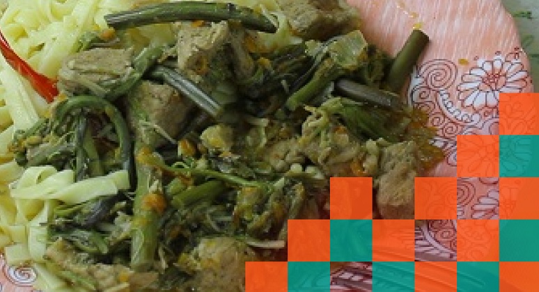 Тушёная свинина с солёными побегами папоротника Орляк и грибами Энокитаке