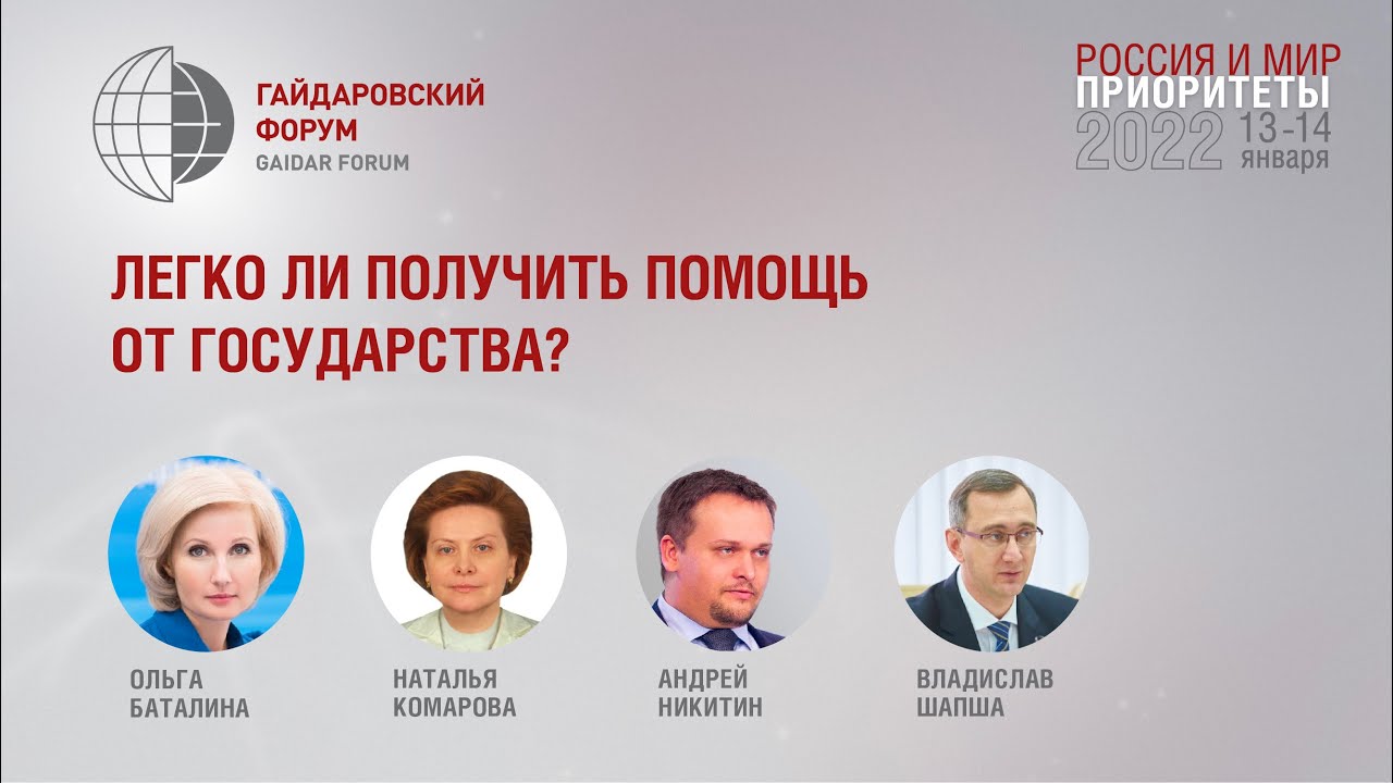 Участники: Ольга Баталина, первый заместитель Министра труда и социальной защиты Российской Федерации Наталья Комарова, губернатор Ханты-Мансийского автономного округа – Югры Андрей Никитин, губернатор Новгородской области Владислав Шапша, губернатор Калужской области Эффективность социальной поддержки зависит, в первую очередь, от доступности социальных институтов для любого гражданина страны. Современные информационные технологии принципиальным образом расширяют возможности для расширения этой доступности. Одним из последствий пандемии 2020–2021 годов стал информационно-организационный прорыв в предоставлении социальных услуг населению и ее главным социальным группам – семьям с детьми, лицам, потерявшим и ищущим работу, старшему поколению и пр. Как закрепить и развить достигнутый успех? Вопросы для обсуждения: • Нужно ли и как переходить к адресности в оказании социальных услуг населению? • Какие задачи решает так называемое социальное казначейство? • Насколько целесообразно и реалистично проактивное предоставление социальных услуг населению? • Каковы функции, место и роль социального контракта в системе социальной защиты и каковы перспективы его широкого применения?