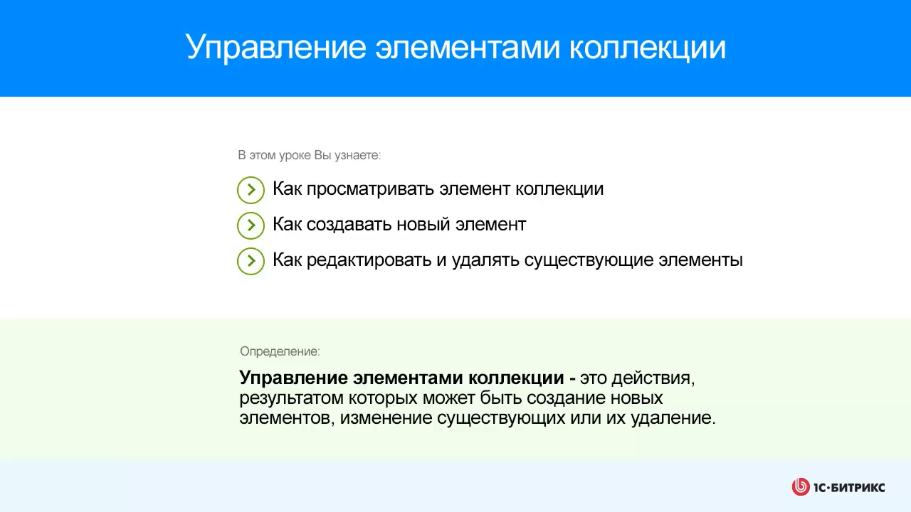 Управление элементами коллекции: - Как просматривать элемент коллекции - Как создавать новый элемент - Как редактировать и удалять существующие элементы К уроку курса Контент-менеджер: https://dev.1c-bitrix.ru/learning/course/index.php?COURSE_ID=34&LESSON_ID=1858