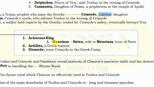 1. Troilus and Criseyde is an epic poem by Geoffrey Chaucer which re-tells in Middle English the tragic story of the lovers Troilus and Criseyde set against a backdrop of war during the Siege of Troy. 2. It is based on Trojan War, it is a story Troilus, worrier falls in a love with a young, beautiful widow Criseyde but eventually he had been deceived by the lady and he dies in War, it is a long poem where using Rhyme Royal. 3. Chaucer gives a message that women cannot be trusted. 4. This poem is often considered the source of the phrase: "all good things must come to an end" 5. Chaucer has used Rhyme Royal Stanza in Troilus and Criseyde which was invented by him. 6. Troilus and Criseyde originally composed in Rhyme Royal and was written by Homer who gave the Character of Troilus and Criseyde but this plot given by Homer later used by Italian Poet Boccaccio in his work Il Filostrato. 7. In other words Chaucer shows great influence of Filostrato by—Boccaccio ----- Note: Il Filostrato is a poem by the Italian writer Giovanni Boccaccio, and the inspiration for Geoffrey Chaucer's Troilus and Criseyde