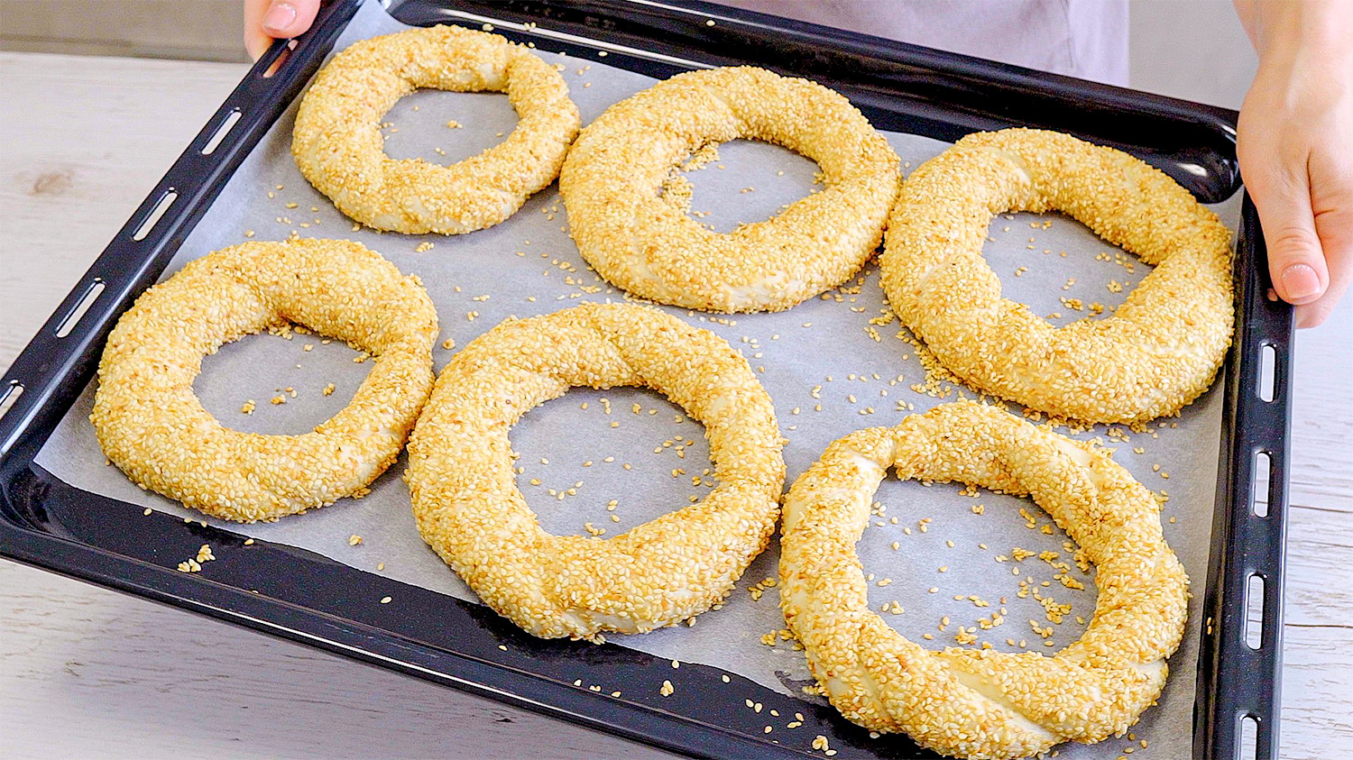 Вода (350 мл). Сахар (1 ст л). Сухие дрожжи (7 г). Мука (580 г). Соль ? (1 ч л). Растительное масло (2 ст л). Замесите тесто. Смазать растительным маслом. Накройте и оставьте на 20 минут. Кунжут (150 г). Обжарить на сковороде. Вода ? (100 мл) + мёд (2 ст л). Разделить на 8 частей. Ставьте на 10 минут. Выпекать при 180 °C 20-25 минут #симиты #бублики