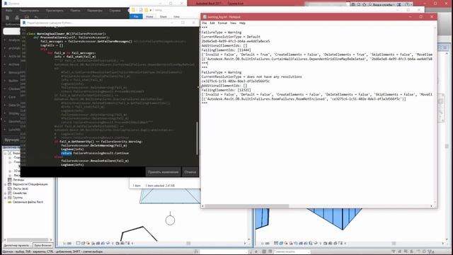Класс, на основе интерфейса, который заменяет стандартную обработку ошибок. Можно автоматически выключать, исправлять ошибки, запрещать выполнение действий влекущих ошибки и т.д. После активации работает даже с выключенным Dynamo. https://knowledge.autodesk.com/search-result/caas/CloudHelp/cloudhelp/2016/ENU/Revit-API/files/GUID-52A45CC1-3BB4-48B4-BFC7-F6F8666C2AA4-htm.html - Всё что касается способов обработки ошибок. https://thebuildingcoder.typepad.com/blog/failure/ - Темы по обработке ошибок от Jeremy Tammik`a. https://forums.autodesk.com/t5/revit-api-forum/get-a-list-of-all-the-revit-warnings/td-p/6733180 - Тема с "секретной" техникой получения ВСЕГО списка ошибок, в удобочитаемом виде. https://1drv.ms/u/s!AvhRIUtKr8n2g6MW1ET7yBlTUyqnkw - файл скрипта P.S. количество употреблений слова "собственно" OVER 9 TAUSEND sorry ._.