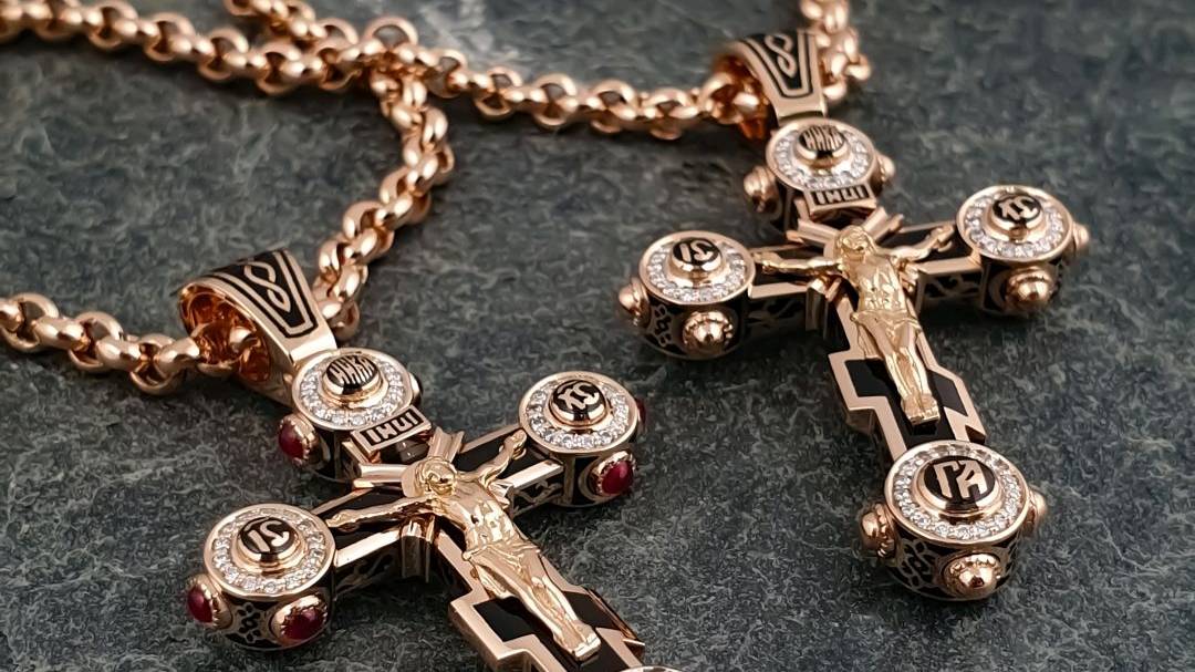 Русский православный крест из розового золота с черной эмалью