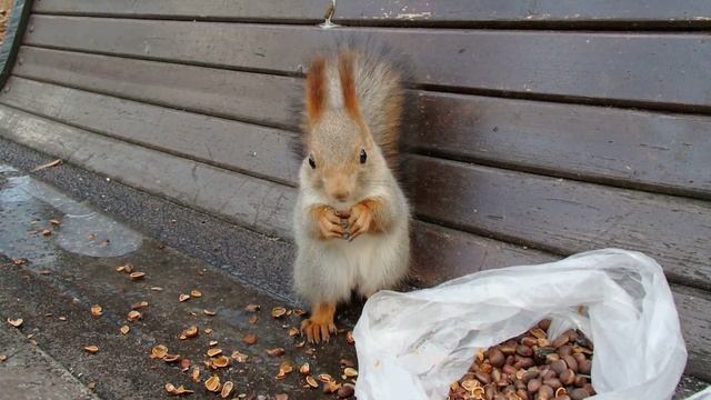Молодая, неопытная и пугливая белочка пришла поесть орешков