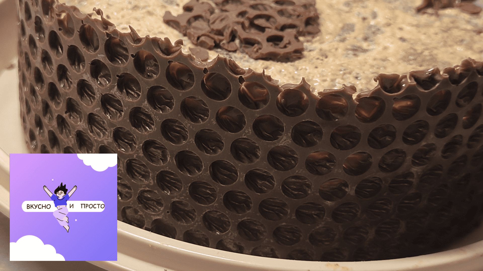 Простой в исполнении,но очень эффектный декор на торт своими руками. Пупырчатую пленку вымыть и вырезать полоску трафарет шириною на 2-3 см больше высоты торта и длиною на 2-3 см больше длины окружности торта.Растопленный шоколад выложить на пупырчатую сторону пленки, равномерно разровнять по всей площади полосы. Дать застыть до эластичности.Переложить пупырку с шоколадом по площади окружности торта, шоколадом к крему. Прижать полоску и поставить торт в холодильник до полного застывания шоколада.От застывшего шоколада аккуратно, придерживая торт, отделить пупырку-пленку. Украсить на свое усмотрение. На торт диаметром 24 см,высотой примерно 15 см, -ушло на декор 180гр белого шоколада и 50гр горького.Лучше брать темный шоколад.