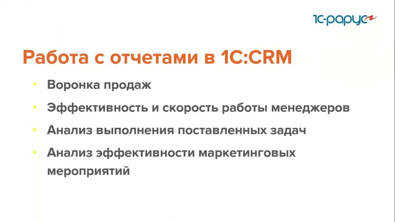 Запись вебинара от 30 марта 2022 года на тему "Сбор накопленной аналитики в 1С:CRM". Программа вебинара: Воронка продаж в 1С:CRM. Эффективность и скорость работы менеджеров. Анализ выполнения поставленных задач. Анализ эффективности маркетинговых мероприятий.