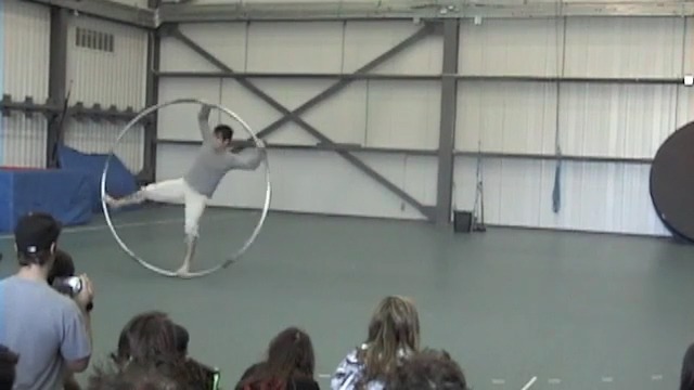 Трюки гимнаста с огромным хула-хупом