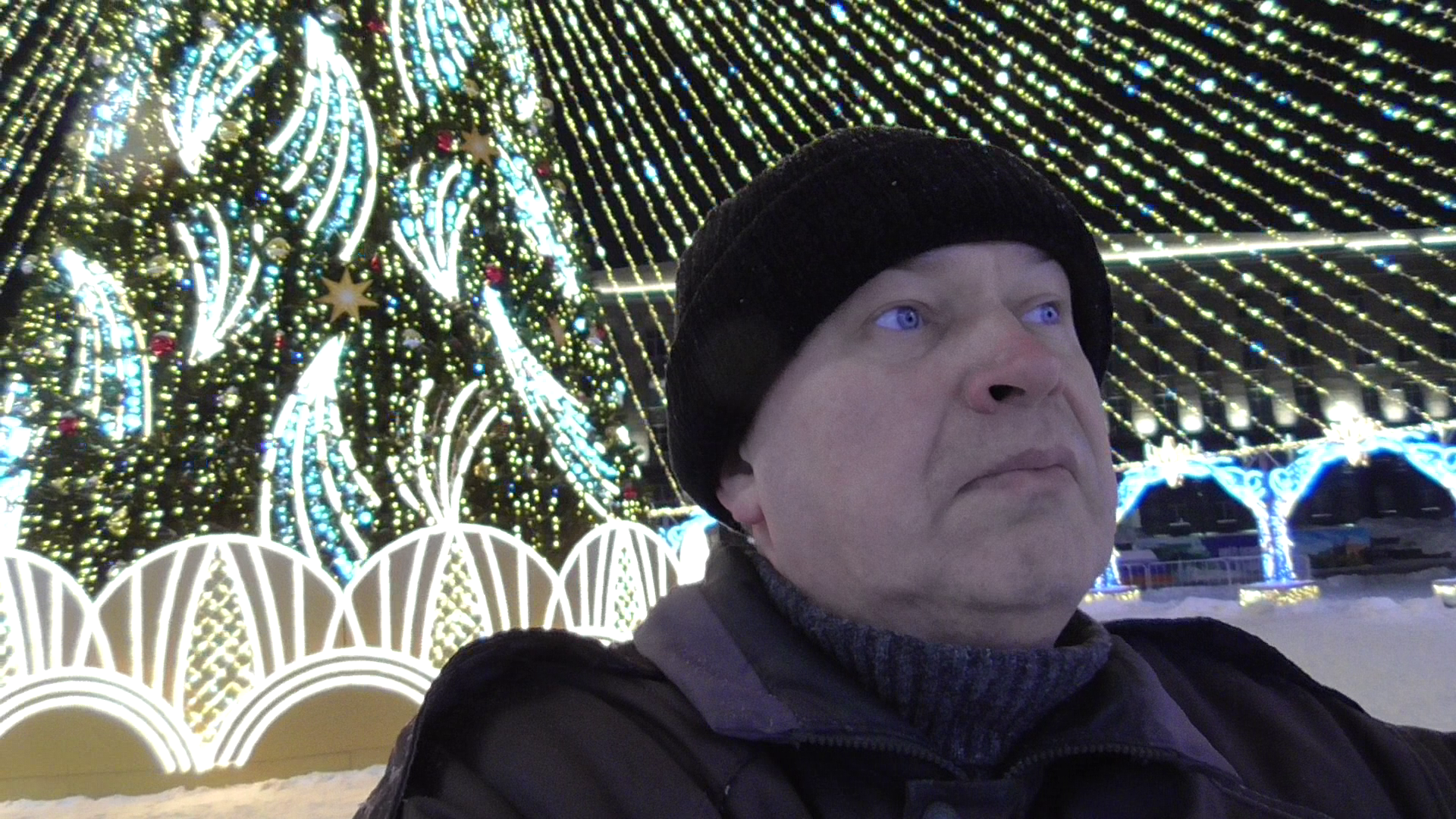 Геннадий Горин вечером в городе, гирлянда и новогодняя ёлка, город Орёл