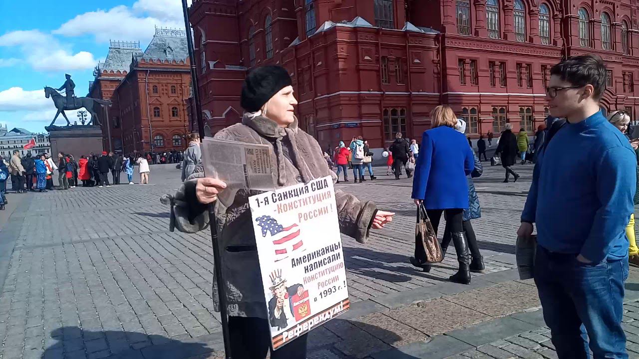 Москва. Пост № 1. Манежная Площадь. Одиночный информационный пикет участника Национально-Освободительного Движения (НОД). Ежедневно пикетчики Национально-Освободительного Движения рассказывают соотечественникам о правовой диверсии в нашей конституции о внешнем управлении государством и о идущем сборе решений (подписей) граждан с 1 марта за проведение всенародного референдума по изменению статей 9.2 ; 13.2 и 15.4 нашей конституции, что позволит вернуть нам суверенитет России, утерянный в 1991-93 гг.