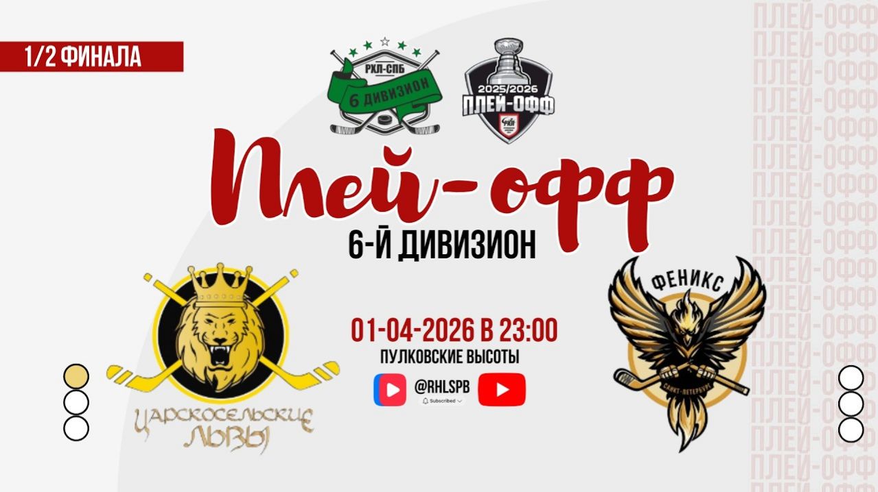 🏒 ХК «Царскосельские львы» - ХК «Феникс 2» 🏆 Он лайн трансляция 🏅Плей-офф, 1/2 финала, Матч №2 - «6-й дивизион» 🎯 Счет в серии 1:0 📍Пулковские Высоты 📅 01.04.2026 г. ⏰ 23:00 🎙 Дернов Иван 🎥 Трансляция доступна на трёх платформах: • YouTube https://youtube.com/live/60-auLtxFYQ?feature=share • VK Video https://vkvideo.ru/video-130581940_456241422?list=61e.. • RUTUBE https://rutube.ru/video/private/1a48147fc16d943da1cd6f03ddfc814f/?p=4b9jDlB574ya8zgdYd35UQ 👉 РХЛ это: 💥Лучшая спортивная составляющая, конкурентный хоккей 💥Общероссийские турниры на регулярной основе как в Санкт-Петербурге, так и в других городах. 💥Прямые трансляции матчей с комментатором 💥Лучшие, эксклюзивные и индивидуальные медали и награды. 💥Лучшая вечеринка и церемония награждения 🤚До встречи на льду