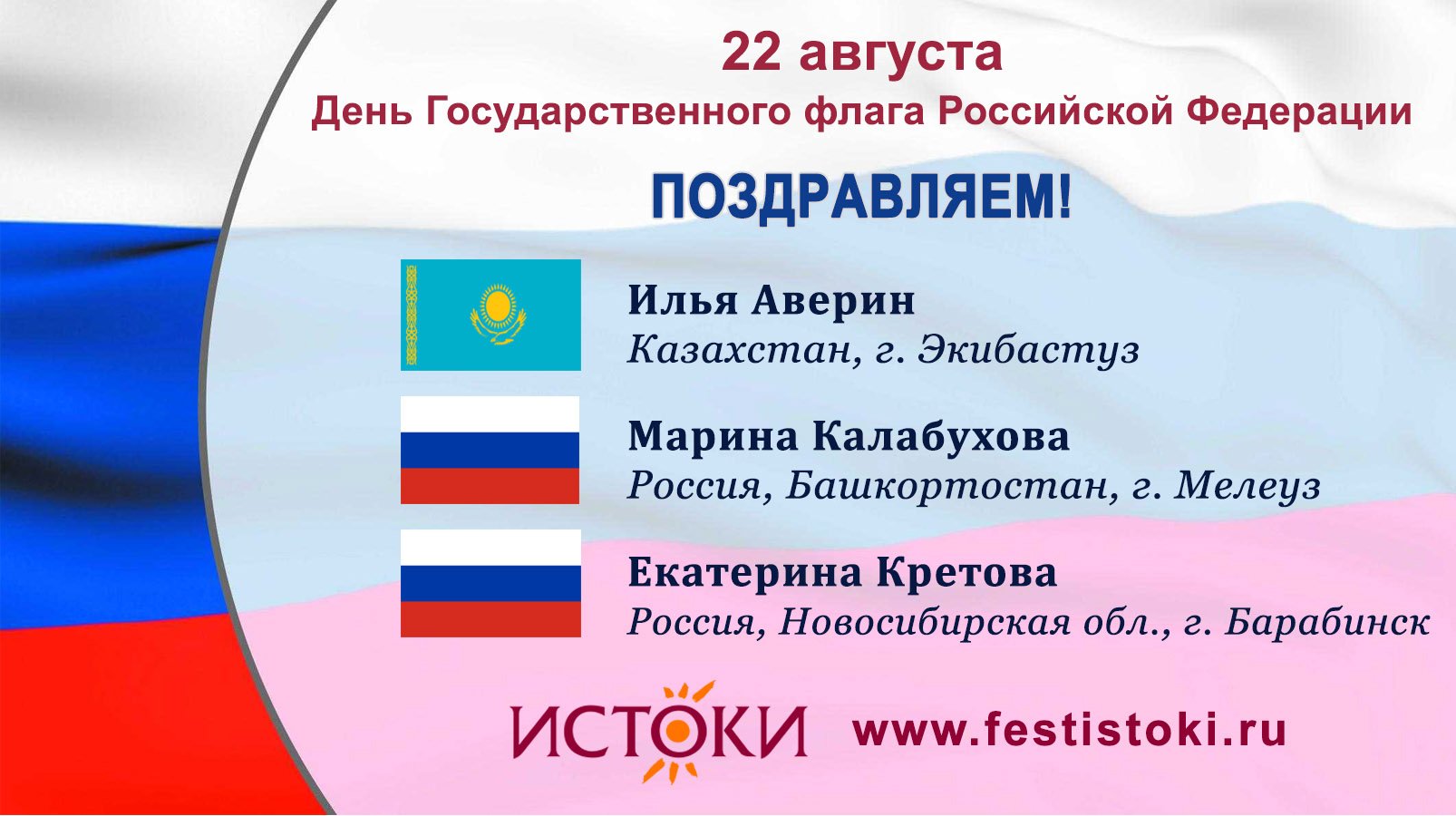 С Днем Государственного Флага РФ поздравляют - Илья Аверин (Казахстан, г. Экибастуз) Марина Калабухова (Россия, Республика Башкортостан, г. Мелеуз) Екатерина Кретова ( Россия, Новосибирская область, г. Барабинск) ------- Сайт: www.festistoki.ru / www.festistoki.com E-mail: festistoki@mail.ru
