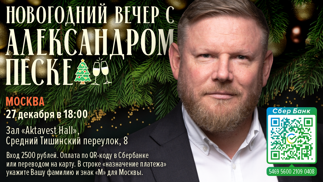Авторские встречи с Александром Песке. 25 декабря 2023 в Минске, 27 декабря в Москве и 28 декабря в Санкт-Петербурге. Поспешите приобрести билет! Количество мест ограничено! Минск, 18:00, зал "Форум" в "Президент-Отель", ул. Кирова 18. Вход 60 белорусских рублей, оплата на входе. Бронь билета по электронной почте: ap@aboutswiss.ch Москва, 18:00, зал "Актавест Халл", Средний Тишинский переулок 8. Вход 2'500 рублей. Оплата по QR-коду Сбербанка или переводом на карту Сбербанка 5469 5600 2109 0408. В строке "назначение платежа" укажите Вашу фамилию и знак "М" для Москвы! Санкт-Петербург, 18:00, зал "Акрополис", ул. Достоевского 19/21. Вход 2'500 рублей. Оплата по QR-коду Сбербанка или переводом на карту Сбербанка 5469 5600 2109 0408. В строке "назначение платежа" укажите Вашу фамилию и знак "П" для Санкт-Петербурга!