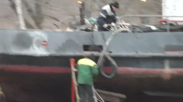 Набережная, речные суда катер, баржа, буксир и кран на Москва-реке