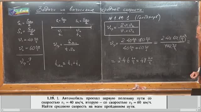 Физика.7кл. Задачник Кирик Л.А. 2002-112с 00:25 - 00:27 Сегодня мы с вами решаем задачи: Задачи на вычисление средней скорости. 02:36 - 02:43 Задача номер 3.7. Автомобиль проехал 50 километров за полчаса, затем еще 150 километров за два часа. 02:51 - 02:53 Определите среднюю скорость автомобиля на всем пути. 04:17 - 04:21 Итак, средняя скорость, V средняя, равняется отношению s общего, это весь путь, пройденный на данном участке траектории, к времени t общее, который для этого потребовался. 07:02 - 07:04 Ответ. Средняя скорость автомобиля равна 80 км в час. 07:46 - 07:49 Следующая задача номер 3-9. 08:10 - 08:12 На гонках велосипедист проехал сначала 15 км со скоростью 45 км в час, а еще затем 28 км со скоростью 42 км в час. 08:17 - 08:19 Определите среднюю скорость велосипедиста 13:37 - 13:39 Ответ: Средняя скорость велосипедиста на всей дистанции — 43 км в час. 13:48 - 13:50 Обратите внимание на очень важный факт. Он вам может помочь. Найти ошибку в своем решении если вы её допустите. Средняя скорость всегда меньше наибольшей и больше наименьшей. 43 км в час это больше чем 42 и меньше чем 45. Этим будем пользоваться для самопроверки. 14:08 - 14:10 Теперь более сложная задача. 14:40 - 14:42 Автомобиль проехал первую половину пути со скоростью V1 — 40 км в час, а вторую со скоростью 60 км в час. Найти среднюю скорость на всем пройденном пути. 22:10 - 22:12 Что у нас за единицы получится в ответе? 22:22 - 22:24 Ответ будет в километрах в час. 22:40 - 22:42 48 километров в час. 23:06 - 23:08 Вот на следующем уроке мы рассмотрим задачу, где действительно средняя скорость будет вычисляться по формуле среднего арифметического. То есть сумму делишь пополам. 23:14 - 23:16 И последнее, что я хотел вам сказать. Нам для того, чтобы найти среднюю скорость, в первую очередь не бояться. Запомните, мы с вами решаем задачу, как говорят физики, в общем виде. 23:26 - 23:28 Это значит, нам не нужны числа. И если у вас какой-то величины нет в условии задачи, вы смело предполагаете, что она вам известна. 23:34 - 23:36 Ведь букву, которой обозначается эта величина, вы же знаете. Так пользуйтесь этой буквой, предполагая, что за этой буквой стоит какое-то значение. При решении задачи ошибок, эта величина, отсутствующая в условии задачи, либо сократится в ходе решения, либо она уничтожится. 23:50 - 23:52 Вот это очень мощное преимущество решения задачи в общем виде. Мы решаем не в числах. Сначала поделили всю задачу на шаги. На первом шаге нашли промежуточное число, на втором шаге какое-то промежуточное число и пришли к ответу. 24:00 - 24:02 Это решение задачи по частям. 24:02 - 24:04 Решение задачи в общем виде принципиально другое. К этому надо привыкнуть. Вы будете испытывать на первых порах определённые затруднения. Но зато это даст вам огромные преимущества в дальнейшем. Вы сможете решать задачи, которые по частям не решаются вообще. 24:12 - 24:14 Решение задачи по частям действительно не решается. Она решается именно в общем виде. 24:16 - 24:18 Мы предположили, что мы знаем, чему равняется S общее, использовали эту величину в буквенном представлении в ходе решения, а потом где-то она сократилась. 24:22 - 24:24 Вот такая мощнейшая методика решения задач. И в дальнейшем мы почти всегда будем решать задачи в общем виде. Это клип - ускоренного в 1,5раза + сжатого в 2раза видео урока, преподавателя физики, Одессита, Павла Андреевича. Оригинал можно найти по ссылке: https://www.youtube.com/@pvictor54 Nelson X