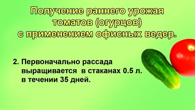 *Лучшие 10 сортов томатов из моей коллекции - каталог и условия приобретения на 2022год* https://clck.ru/XJGYk Почти каждый садовод хочет получить первый урожай томатов пораньше. хотя бы в начале или середине июня. Год назад у меня был на эту тему ролик. Ссылка на него будет в конце этого ролика. Кратко уточню и напомню некоторые моменты. Для раннего урожая мне очень нравится способ посадки рассады в офисные ведра с боковыми отверстиями. Сажаю я для этого от 4 до 6 кустов раннего сорта Батяни. Больше не надо. Ведра занимают много места. Вопрос -Чем этот способ отличается от других. Основное - рассада выращивается в ведрах и в этих же ведрах, не вынимая, высаживается на грядку. Отверстий в офисных ведрах вполне хватает, чтобы через них корни вышли и разошлись по сторонам. Во-вторых, для хорошего раннего урожая нам надо к моменту высадки в грунт иметь большую развитую корневую систему у томата. В ведрах эта корневая получается объемом 10л. Но главное не вырастить, а главное без малейших повреждений корней посадить рассаду в грунт. Рассаду выращенную в гибких пакетах литров на 5 или 10 - очень сложно без повреждений высадить. Из ведер на 5 или 10л также сложно сделать перевалку не развалив корневой ком. ТАБЛИЦА. Получение раннего урожая томатов(огурцов) с применением офисных ведер. 1.Рассада для раннего урожая сажается в январе - феврале. В зависимости от вашего климата. 2.Первоначально рассада выращивается в стаканах 0.5 л в течении 35 дней. 3. Через 35 дней рассада перевалкой рассаживается в офисные ведра. Отверстия в ведрах закрываются скотчем. Освещение - 16 часов в сутки. Светильник обыкновенный -120см длиной, лампы люминесцентные или светодиодные. Один светильник на 4-6 ведер. 4.Полив осуществляется умеренный. Начиная от 200мл в неделю. Через 3 недели идет комбинированный полив через верх и через поддон. 5.При отставании рассады в развитии чередуются один раз в неделю следующие подкормки- Монокалийфосфат Кальциевая селитра Магбор Растворы делаются по 1 гр на 1литр поливочной воды, без предварительного увлажнения. 6. Сорта подбираются только с ранними сроками созревания. Низкорослые или высокорослые. Желательна нормировка пасынков и кистей томатов. 7. Высадка томатов в грунт только после прогрева до 18-20 гр на глубине 20 см. КОНЕЦ ТАБЛИЦЫ, Кратко, перечислю что надо сделать для получения раннего урожая с применением офисных ведер. Рассаду для раннего урожая надо посадить пораньше.Я сажаю в феврале.. Если со сроками посадки опаздываю, то сажаю пророщенные семена сразу в стаканы 0.5л. без пикировки. Рассаду держу в стаканах где-то 35 дней, за это время на ней вырастает около 8 или 9 листьев. 35 дневной рассаде я делаю перевалку в 10л офисные ведра. Для 4 или 6 ведер вполне хватает одного простого светильника с двумя лампами 1м20см длинной. Подсветка идет 16 часов в сутки. Напомню - рассада у меня растет в подвале, в цоколе. при температуре около 20 гр. После перевалки самое важное рассаду не залить.В начале на неделю вполне хватает 200мл воды. От излишнего полива земля в ведре может закиснуть. Через 3 недели можно переходить на умеренный комбинированный полив в поддон и через верх. После перевалки в ведра, если рассада отстает в развитии, можно чередуя подкормить МКФ, Кальциевой селитрой и Магбором. Удобрения берутся по 1 гр. на литр и полив идет этим раствором без предварительного увлажн