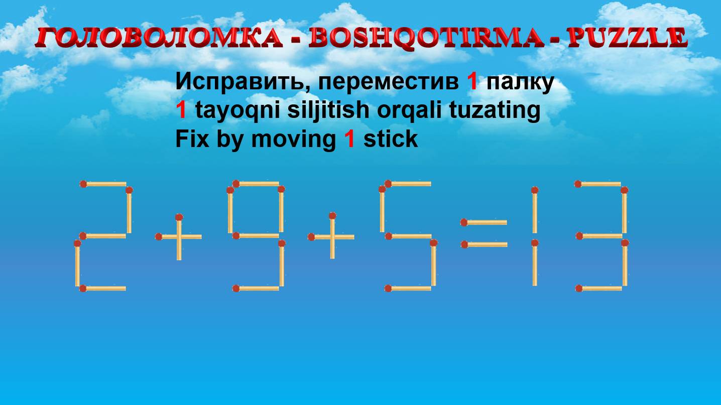 ГОЛОВОЛОМКА - BOSHQOTIRMA – PUZZLE. Спичка. 2+9+5=13, 7+3-2=6, 4+5+3=10, 3+5-2=2