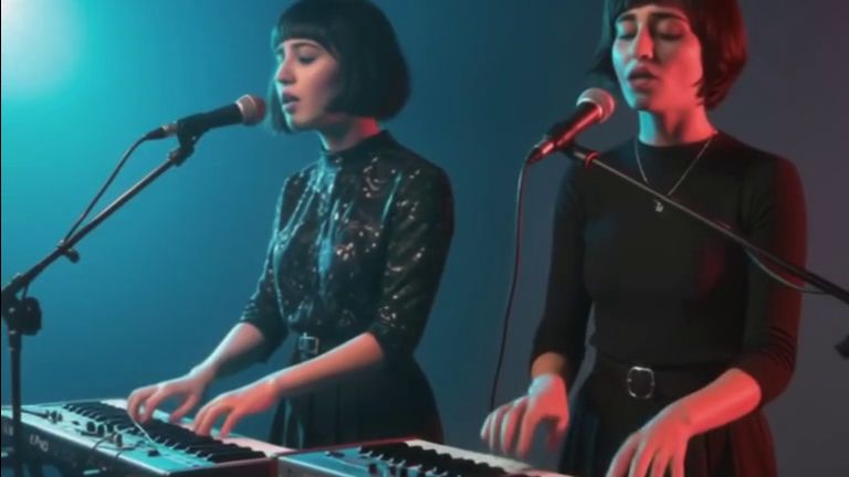 Сгенерированное вертикальное видео. Две девушки играют на синтезаторах