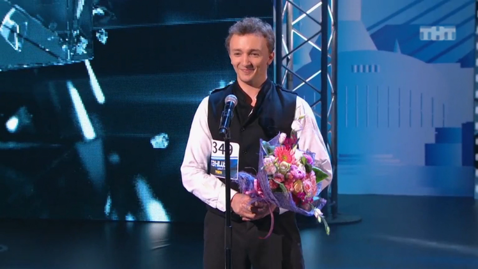 28 лет, г.Москва. Евгений с первой же секунды заинтриговал жюри и зрителей, выйдя на сцену с букетом цветов, в танцы его не взяли, а букет был для Ляйсан.