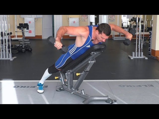 Описание упражнения Это упражнение является аналогом махов гантелями в стороны в наклоне. С той лишь большой существенной разницей, что здесь не нужно следить за спиной и её наклоном. Лавка всё сделает за вас. Поэтому с технической стороны – оно очень лёгкое. Несмотря на то, что оно на заднюю дельту – верх спины здесь тоже работает, так как сделать так, чтобы лопатки были полностью неподвижны – не получится. Основные фишки 1. Чтобы задняя дельта работала по максимуму – нужно в верхней точке разворачивать руки ладонями назад. Локти при этом должны смотреть по возможности вверх. Конечно, на 100% так сделать не получится, они всё равно будут смотреть вверх и назад, но к этому нужно стремиться. 2. В нижней точке руки полностью выпрямляем. Плечи должны максимально растянуться. 3. Угол наклона лавки – небольшой: 20 – 30 градусов. Если сделать больше – то уже будут средние пучки дельт работать. 4. Это упражнение хорошо подойдёт как в конце тренировки на плечи, так и в конце тренировки на спину. так как задняя дельта, хоть и называется дельта, но по функциям и месту расположения она ближе к спине.