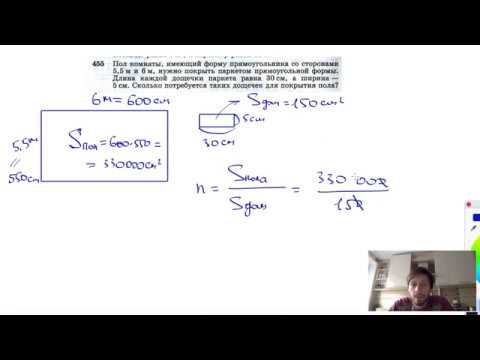 №455. Пол комнаты, имеющий форму прямоугольника со сторонами 5,5 м и 6 м, нужно покрыть паркетом прямоугольной формы. Длина каждой дощечки паркета равна 30 см, а ширина — 5 см. Сколько потребуется таких дощечек для покрытия пола? Поддержать канал рублём - 5469400944002125 (Сбербанк) Мой второй канал для подготовки к ЕГЭ и ОГЭ - https://www.youtube.com/ЕвгенийСумин Инстаграм - https://www.instagram.com/EGE_OGE.math Личный инстаграм - https://www.instagram.com/ee_sumin VK - https://vk.com/evgeniysumin FB - https://www.facebook.com/EvgeniySumin