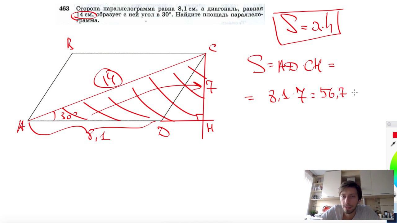 №463. Сторона параллелограмма равна 8,1 см, а диагональ, равная 14 см, образует с ней угол в 30°. Найдите площадь параллелограмма. Поддержать канал рублём - 5469400944002125 (Сбербанк) Мой второй канал для подготовки к ЕГЭ и ОГЭ - https://www.youtube.com/ЕвгенийСумин Инстаграм - https://www.instagram.com/EGE_OGE.math Личный инстаграм - https://www.instagram.com/ee_sumin VK - https://vk.com/evgeniysumin FB - https://www.facebook.com/EvgeniySumin