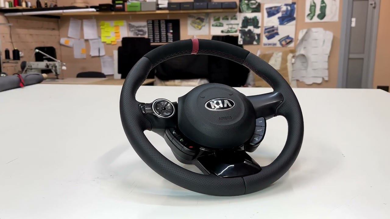 Перетяжка руля Kia Soul в сочетании алькантары и экокожи, сделали бордовую нулевую метку