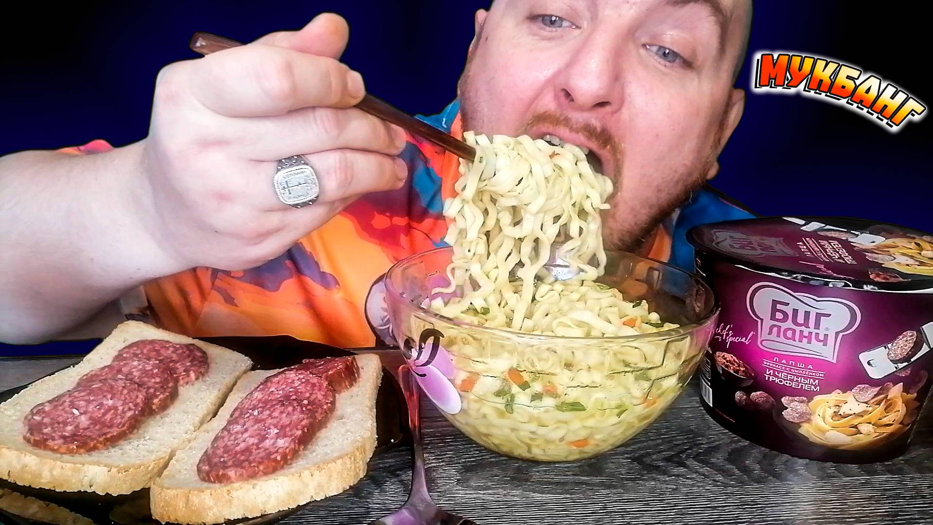 МУКБАНГ|ОБЖОРЫЧ|БИГ ЛАНЧ ЛАПША ФРИКАСЕ С ЦЫПЛЁНКОМ И ЧЁРНЫМ ТРЮФЕЛЕМ|КОЛБАСА САЛЯМИ