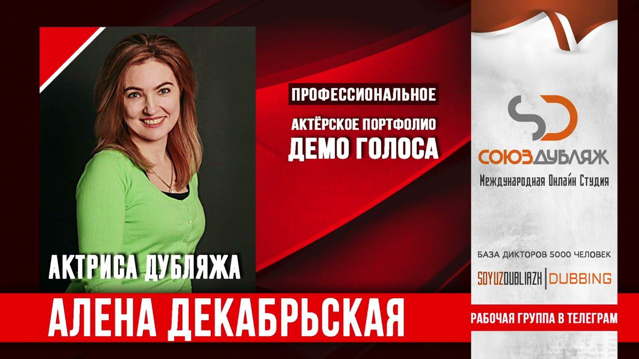 #СоюзДубляж #БазаДикторов #Озвучка ✔️Алена Декабрьская, актриса - диктор озвучивания. Международная Онлайн-Студия "СОЮЗДУБЛЯЖ" - профессиональная озвучка и дубляж. ▪️Рабочая группа в Телеграм: https://t.me/soyuzdubliazh ▪️Контакт для связи: https://t.me/SoyuzAdmin ▪️Подпишись:https://www.youtube.com/c/SOYUZDUBLIAZH ▪️Сайт: https://www.soyuzdubliazh.com/ Лучшие голоса для вашей аудиорекламы и видеороликов. База дикторов - 5 000 человек, профессионального уровня на ENG| FR| TR| RU| ISR| AZ| UA| KZ| UZ| языках. Мужские и Женские топовые голоса для озвучки любых проектов, таких как: Рекламы, Презентации, Фильмы, Сериалы, Игры, Мультфильмы, ТВ Шоу, Аудио-видео визитки. ✔️Сотрудничая с нами вы получаете свой проект под ключ, не выходя из дома или офиса. Наша слаженная команда из лучших дикторов, актёров озвучивания, режиссёров и звукорежиссёров в кратчайшие сроки озвучат или отдублируют ваш заказ на профессиональном уровне. Образцы работ нашего портфолио вы сможете посмотреть на канале СОЮЗДУБЛЯЖ. ВНИМАНИЕ: ✔️Мы приглашаем специалистов озвучки к сотрудничеству в нашей команде. Вы можете пройти по ссылке в наш телеграм канал и связаться с Админом для обсуждения. ✔️Всем заказчикам подобных медиа проектов по озвучки и дубляжу фильмов, сериалов, документалок обращаться непосредственно к Админу Телеграм группы СОЮЗДУБЛЯЖ, пройдя по ссылке: Проходи по ссылке: https://t.me/soyuzdubliazh International Online-Studio SOYUZDUDLIAZH presents a highly professional approach in voice-over and dubbing. ▪️Our working group https://t.me/soyuzdubliazh ▪️Chief manager https://t.me/SoyuzAdmin ▪️Follow https://www.youtube.com/c/SOYUZDUDLIAZH ▪️Web: https://www.soyuzdubliazh.com/ We offer You the best Voices for your Audio commercials and Video`s. Our Database contains over 5 000 voices of native speakers and high-class foreign language specialists in ENG| FR| TR| RU| ISR| AZ| UA| KZ| UZ|. Male & Female top level voices for all the variety of dubbing projects such as commercials, presentations, movies, TV-series, video and computer games, cartoons, TV-shows, audio & video portfolio’s – all in one place. As your business partner we guarantee a turn-key project without you leaving your house or office. Our target is to make sure that the dubbing of your project is made as quick as possible by a well-coordinated and professional team of the best speakers, film and sound directors. To whom it may concern! We invite dubbing specialists to join our team. Please contact our manager on Telegram https://t.me/soyuzdubliazh