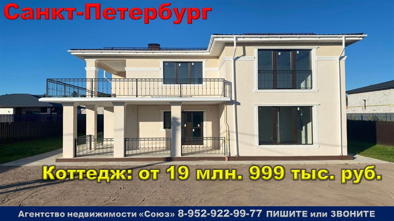 Подпишитесь на нас. Благодарим !!! https://www.youtube.com/@nedvigimoct/videos - мы на Ютубе https://dzen.ru/nedvigimoct?tab=longs&utm_referrer=dzen.ru - мы на Дзене https://rutube.ru/channel/27083000/videos/ - мы на Рутубе https://vk.com/club223108371 - мы в ВК https://ok.ru/lyubayan - мы в Ок Агентство недвижимости «СОЮЗ» Покупайте: Коттеджи в Санкт-Петербурге. Агалатовское c.п. м. Парнас (19 минут на машине) Агент по новостройкам: 89529229977 (WhatsApp) Цены на коттеджи точно такие же как и у застройщика. Коттеджи продаются БЕЗ РИЭЛТОРСКОЙ КОМИССИИ !!!. 4к. коттедж: от 19 млн. 999 тыс. руб. Ежемесячный платеж: 95 803 руб. при ставке 6% Площадь общая: 240,8 м2 Срок сдачи: сдан Срок выдачи ключей: 4 кв. 2022 Договор: К-П Тип дома: блочный Тип отделки: подготовка под чистовую отделку Парковка: отсутсутвует Потолки: 3,01 м. Преимущества:Благоустройство территории. Развитая инфраструктура. Рядом школы, больница. Река и лес рядом. Детская площадка. Описание комплекса:Коттедж находится в поселке, отличающемся чистым воздухом, благодаря своему соседству с лесом. Рядом протекает река Охта. У жителей селения есть возможность наслаждаться всей красотой и великолепием парка бывшей усадьбы Шуваловых, окруженного соснами. Дороги с твердым покрытием асфальтной крошкой. Работают доставки СберМаркет, OZON, Яндекс.Лавка. Детская площадка, праздники в коттеджном посёлке. Уличное освещение. В шаговой доступной вся необходимая инфраструктура - токсовская межрайонная больница 20 минут пешком, 8 минут парк Усадьбы Шуваловых, 10 минут Софийская церковь, 15 минут остановка, 10 минут пешком до школы (без выхода на проезжую часть), 7 минут Конно-спортивный клуб «Гермес» (проводят занятия по иппотерапии), 3 км Заправка 2-этажный коттедж для круглогодичного проживания, 240,8 м2 на участке 6,5 соток в КП в 9 км от КАД по Новоприозерскому шоссе. Коттедж продаётся с отделкой White box и всеми коммуникациями, сделано благоустройство придомовой территории. В коттедже 3 спальни, 2 санузла, просторная кухня-столовая, гардеробная, кабинет, кладовая, котельная, просторный видовой балкон, терраса. Фундамент – монолитная железобетонная плита, стены – газобетонные блоки ЛСР с утеплителем, окна – энергосберегающие мультифункциональные стеклопакеты, входные двери – металлические, кровля – металлочерепица, электричество - 15 кВт. Газ – магистральный (заведён в дом и оплачен). Вода - центральный водопровод, отопление - электрический котёл с возможностью подключения к газовому, автономная канализация септик Итал Био 5 (биологическая станция очистки сточных вод), тёплый водяной пол в местах общего пользования, в комнатах установлены радиаторы. Сделан дренаж участка, засеян газон. Возможна покупка дома с чистовой отделкой – натяжной потолок, обои с покраской в выбранный вами цвет, ламинат, плитка в местах общего пользования и в санузлах, установка сантехники.