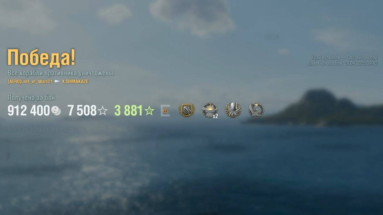 Эсминец Shimakaze. Игрок: Lord_of_Wars21 (NA). Карта: Край вулканов - Случайный бой. Урон: 129к. Shimakaze - Эсминец Японии 10 уровня.