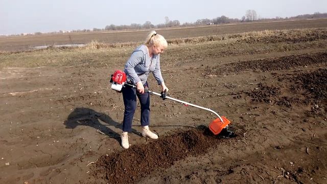 SG230 Стриж + CA100 Насадка Культиватор. Мужчина и женщина пашут вместе.