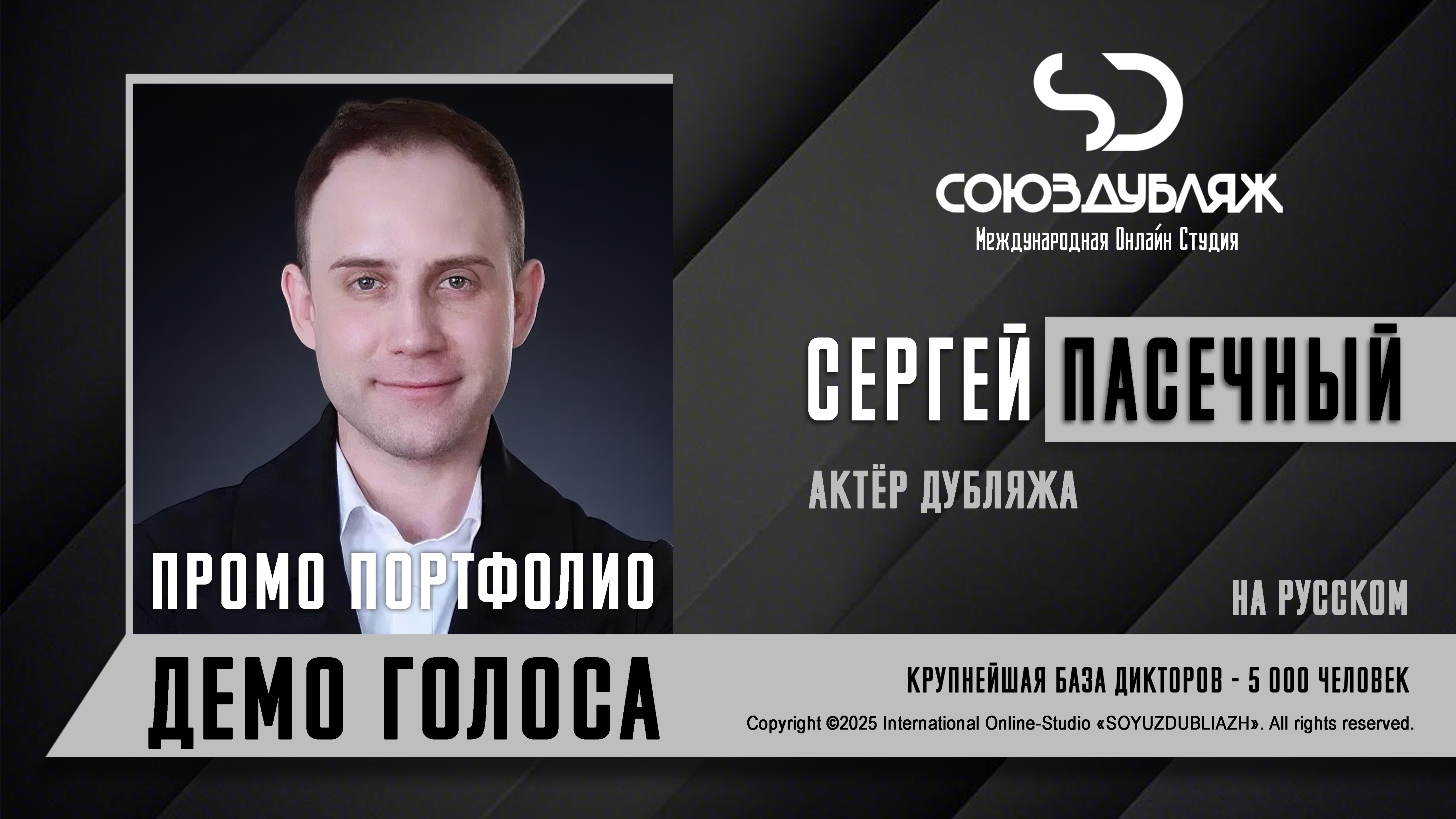 #СоюзДубляж #БазаДикторов #Озвучка ✔️Сергей Пасечный, диктор-актёр дубляжа. Международная Онлайн-Студия "СОЮЗДУБЛЯЖ" - профессиональная озвучка и дубляж. ▪️Рабочая группа в Телеграм: https://t.me/soyuzdubliazh ▪️Контакт для связи: https://t.me/SoyuzAdmin ▪️Подпишись:https://www.youtube.com/c/SOYUZDUBLIAZH ▪️Сайт: https://www.soyuzdubliazh.com/ Лучшие голоса для вашей аудиорекламы и видеороликов. База дикторов - 5 000 человек, профессионального уровня на ENG| FR| TR| RU| ISR| AZ| UA| KZ| UZ| языках. Мужские и Женские топовые голоса для озвучки любых проектов, таких как: Рекламы, Презентации, Фильмы, Сериалы, Игры, Мультфильмы, ТВ Шоу, Аудио-видео визитки. ✔️Сотрудничая с нами вы получаете свой проект под ключ, не выходя из дома или офиса. Наша слаженная команда из лучших дикторов, актёров озвучивания, режиссёров и звукорежиссёров в кратчайшие сроки озвучат или отдублируют ваш заказ на профессиональном уровне. Образцы работ нашего портфолио вы сможете посмотреть на канале СОЮЗДУБЛЯЖ. ВНИМАНИЕ: ✔️Мы приглашаем специалистов озвучки к сотрудничеству в нашей команде. Вы можете пройти по ссылке в наш телеграм канал и связаться с Админом для обсуждения. ✔️Всем заказчикам подобных медиа проектов по озвучки и дубляжу фильмов, сериалов, документалок обращаться непосредственно к Админу Телеграм группы СОЮЗДУБЛЯЖ, пройдя по ссылке: Проходи по ссылке: https://t.me/soyuzdubliazh International Online-Studio SOYUZDUDLIAZH presents a highly professional approach in voice-over and dubbing. ▪️Our working group https://t.me/soyuzdubliazh ▪️Chief manager https://t.me/SoyuzAdmin ▪️Follow https://www.youtube.com/c/SOYUZDUDLIAZH ▪️Web: https://www.soyuzdubliazh.com/ We offer You the best Voices for your Audio commercials and Video`s. Our Database contains over 5 000 voices of native speakers and high-class foreign language specialists in ENG| FR| TR| RU| ISR| AZ| UA| KZ| UZ|. Male & Female top level voices for all the variety of dubbing projects such as commercials, presentations, movies, TV-series, video and computer games, cartoons, TV-shows, audio & video portfolio’s – all in one place. As your business partner we guarantee a turn-key project without you leaving your house or office. Our target is to make sure that the dubbing of your project is made as quick as possible by a well-coordinated and professional team of the best speakers, film and sound directors. To whom it may concern! We invite dubbing specialists to join our team. Please contact our manager on Telegram https://t.me/soyuzdubliazh