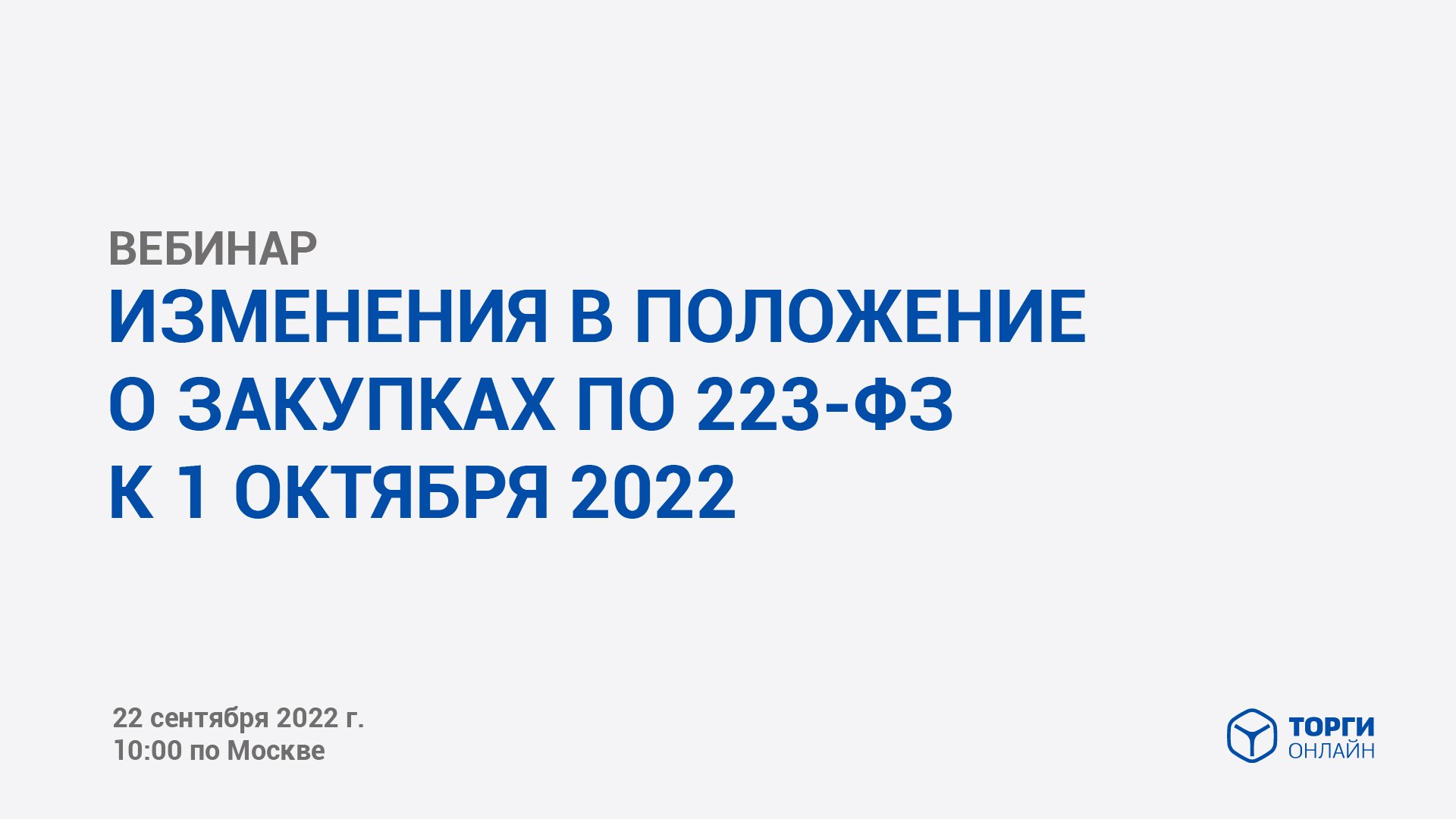 ПРОГРАММА ВЕБИНАРА: - Основные изменения в закупках по Закону 223-ФЗ в 2022 году - Изменения которые уже вступили - Изменения которые необходимо внести в Положение к 01.10.2022 г. - Изменения которые вступят - Ответы на вопросы Преимущества размещения закупок на ЭТП ТОРГИ-ОНЛАЙН по ссылке https://torgi-online.com/zakazchikam/