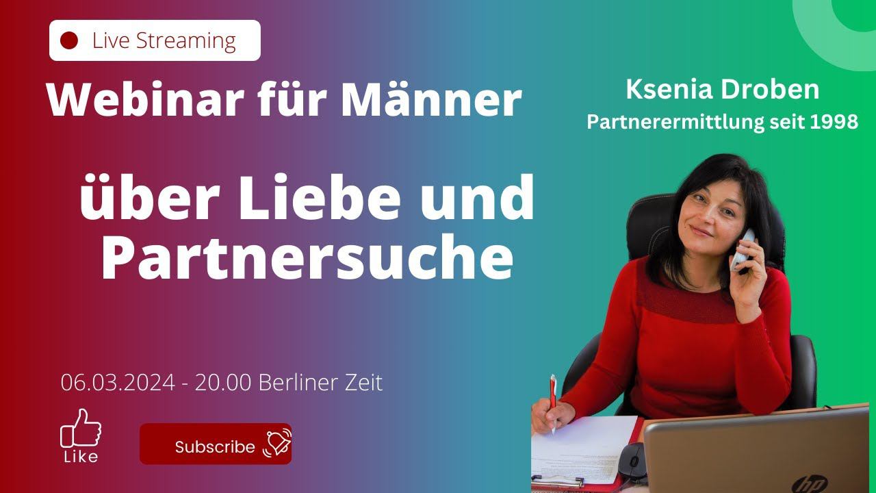 Eine kleine Erinnerung - heute treffen wir uns zum Männerwebinar und lästern über die Frauen und die Welt. Ich möchte Ihnen erzählen, was wir auf der Single Party in Köln erlebt haben. Ich möchte Sie über unsere weiteren Veranstaltungen informieren. Und natürlich beantworte ich alle Ihre Fragen. Das Webinar findet heute, Mittwoch, den 6. März um 20.00 Uhr statt. Wo: YouTube Channel "Ksenia Droben": https://www.youtube.com/@KseniaDrobenPartnervermittlung Alternativ auch Facebook: https://www.facebook.com/ksenia.droben/ Twitch: https://www.twitch.tv/kseniadating LinkedIn: https://www.linkedin.com/in/ksenia-droben-911289148/ Instagram @kseniadroben.agency Tiktok: @kseniamatchmaking Dauer: Ca. 60 Minuten Ich freue mich auf Sie uns Ihre Fragen Unsere weiteren Veranstaltungen: # 16.03 - Online Single Dating Party https://droben-partnervermittlung.de/online-single-dating-zoom/ # 12-14.04 – Single Dating Party in St.Petersburg, Russland https://droben-partnervermittlung.de/single-dating-party-petersburg/ # 17-20.05 - Love Hotel in Bad Mergentheim (Single Party inklusive) https://droben-partnervermittlung.de/love-hotel-pfingsten/ In Planung sind auch Events in Hamburg und Wien, aber da würde ich mich über Restaurantempfehlungen freuen.