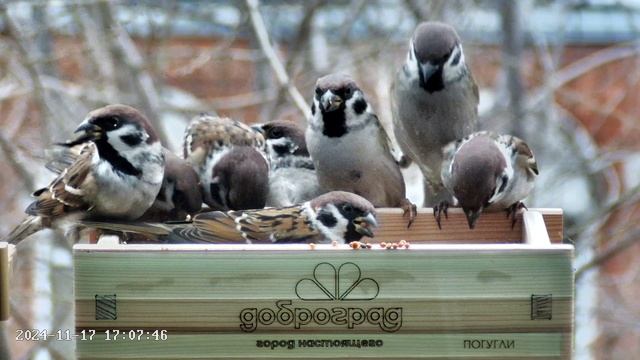Воробьи в кормушке -