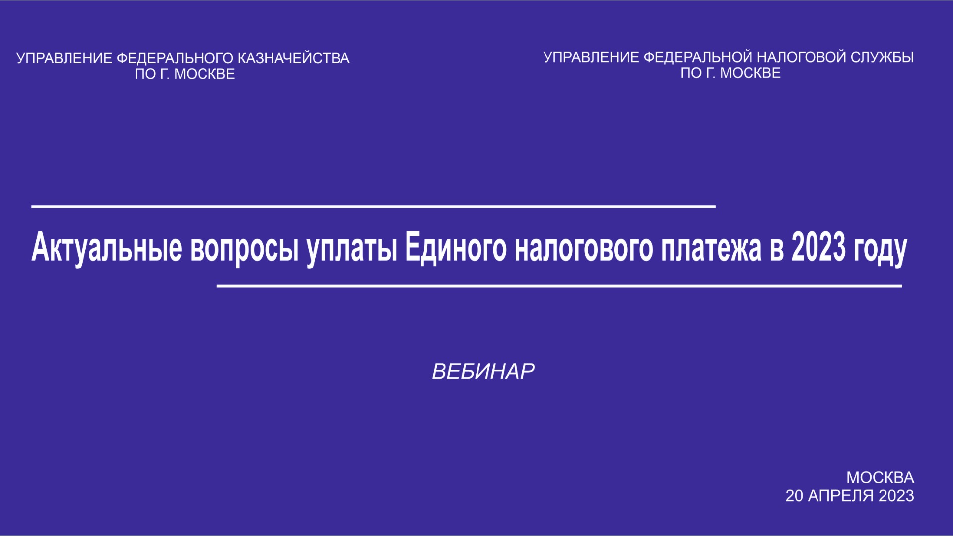 Управление Федерального казначейства по г. Москве сообщает о проведении совместно с Управлением Федеральной налоговой службы по г. Москве 20 апреля 2023 года в 15:00 по московскому времени вебинара на тему «Актуальные вопросы уплаты Единого налогового платежа в 2023 году».