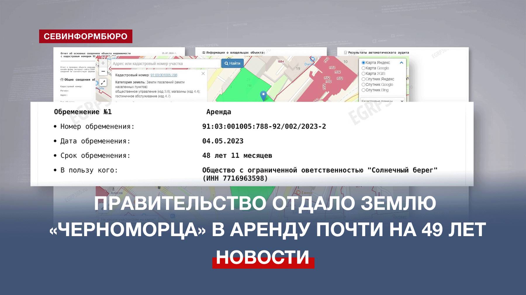 Земля, на которой расположено здание бывшего ЦКБ «Черноморец» вместе с территорией внутреннего двора уже более года находится в частных руках. Департамент по имущественным и земельным отношениям Правительства Севастополя ещё 21 апреля 2023 года полностью передал участок городской земли площадью 4 тысячи 560 квадратных метров в аренду на 48 лет и 11 месяцев Обществу с ограниченной ответственностью «Солнечный берег». Об этом сообщил Сервис проверки недвижимости ЕГРП365 в отчёте, заказанном редакцией телеканала «НТС». Разрешённое использование земли – общественное управление, магазины и гостиничное обслуживание. Подписывайтесь на наш Телеграм-канал: https://t.me/nts_novosti Смотрите новости Севастополя и Крыма на сайте НТС: http://nts-tv.com В нашей группе "ВКонтакте": https://vk.com/ntssevastopol На странице в "Одноклассниках": https://ok.ru/ntssevastopol
