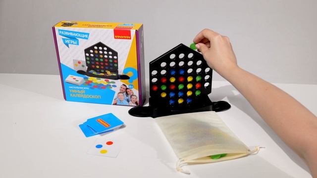 Развивающая настольная игра Bondibon «Шесть подряд» Игроки ходят по очереди. Задача участников заключается в том, чтобы собрать комбинацию из шести фишек своего цвета (например, линию, квадрат или круг), и в тоже время, помешать противнику достичь этой цели. Первый игрок, соединивший шесть частей в одном цвете - победитель! Игра способствует развитию пространственного мышления, зрительно - моторной координации движения, быстрой реакции, фокусировке внимания и формированию умения играть в коллективе, чётко выполняя правила игры. Игра-соревнование на внимательность, сообразительность и скорость. Возраст 6+ Количество игроков 2 чел. Партия игры 15 мин. В комплект входят: фишки – 48 шт., игровое поле – 1 шт., мешочек для хранения – 1 шт. Развивающая настольная игра Bondibon «Умный калейдоскоп» Игроки поочередно опускают в отверстия игрового поля по одной фишке до тех пор, пока им не удастся повторить комбинацию, указанную на карте-задании. Внимание: цвет и расположение фишек, окружающих комбинацию, не имеет значения! Игрок, первым выполнивший задание, забирает карту себе и вставляет следующую карту из колоды. В случае, если игровое поле заполнено, освободите поле от фишек (перевернув его), и начните заполнять его заново. Игрок, собравший первым 5 карт - победитель. Внимание! Расположение фишек на игровом поле должно полностью соответствовать картинке. Игра направлена на развитие зрительно-моторной координации движения, быстрой реакции, познавательных способностей, а также улучшение концентрации внимания. Способствует социальному развитию, а также веселому и полезному времяпровождению. В комплект входят: фишки – 72 шт., карты-задания – 40 шт., игровое поле – 1 шт., мешочек для хранения – 1 шт. Возраст 6+ Количество игроков 1-2. Партия игры 10 мин.