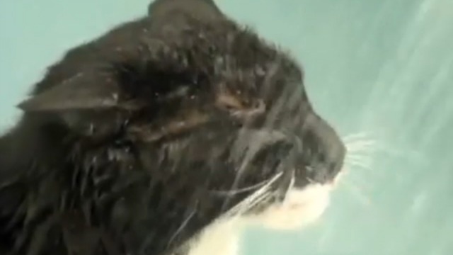 Кошка пьет из душа