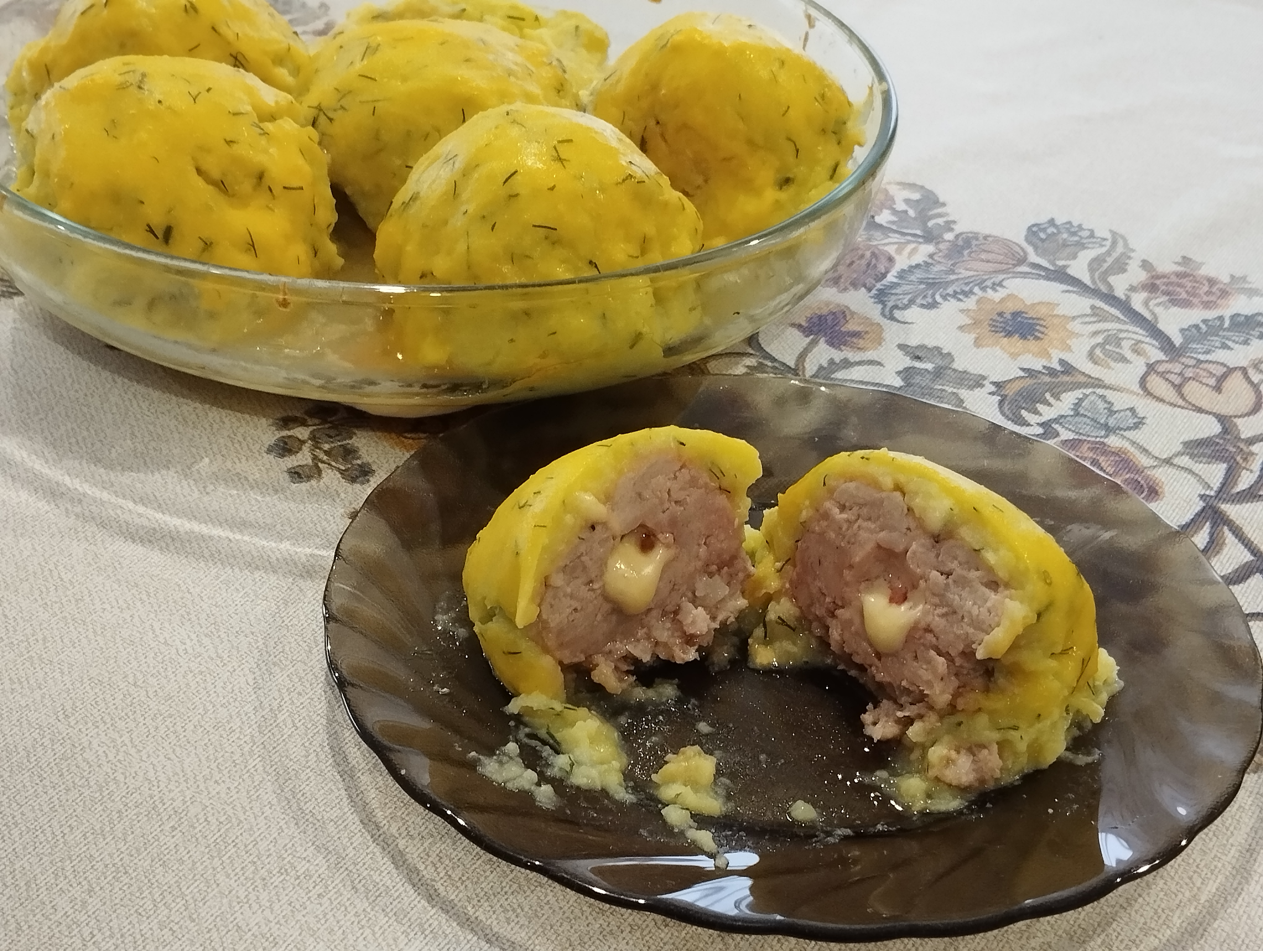 Картофель – 800-900 г Молоко – 3-5 ст.л. Сливочное масло – 30 г Укроп – небольшой пучок Фарш – 450 г Лук – 1 шт. Сыр – 50 г Соль, черный молотый перец – по вкусу Желток – 1 шт.